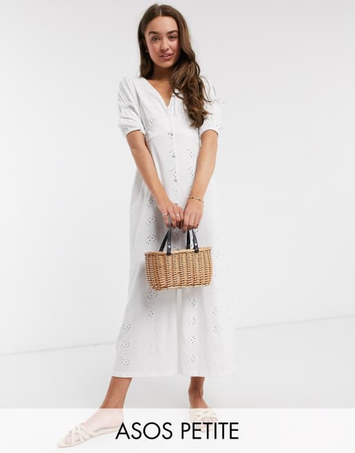 Asos Design Petite Broderie Tea Maxi Dress With Puff Sleeve In White Asos