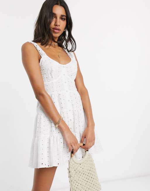 Asos Design Broderie Button Through Tiered Mini Sundress In White Asos