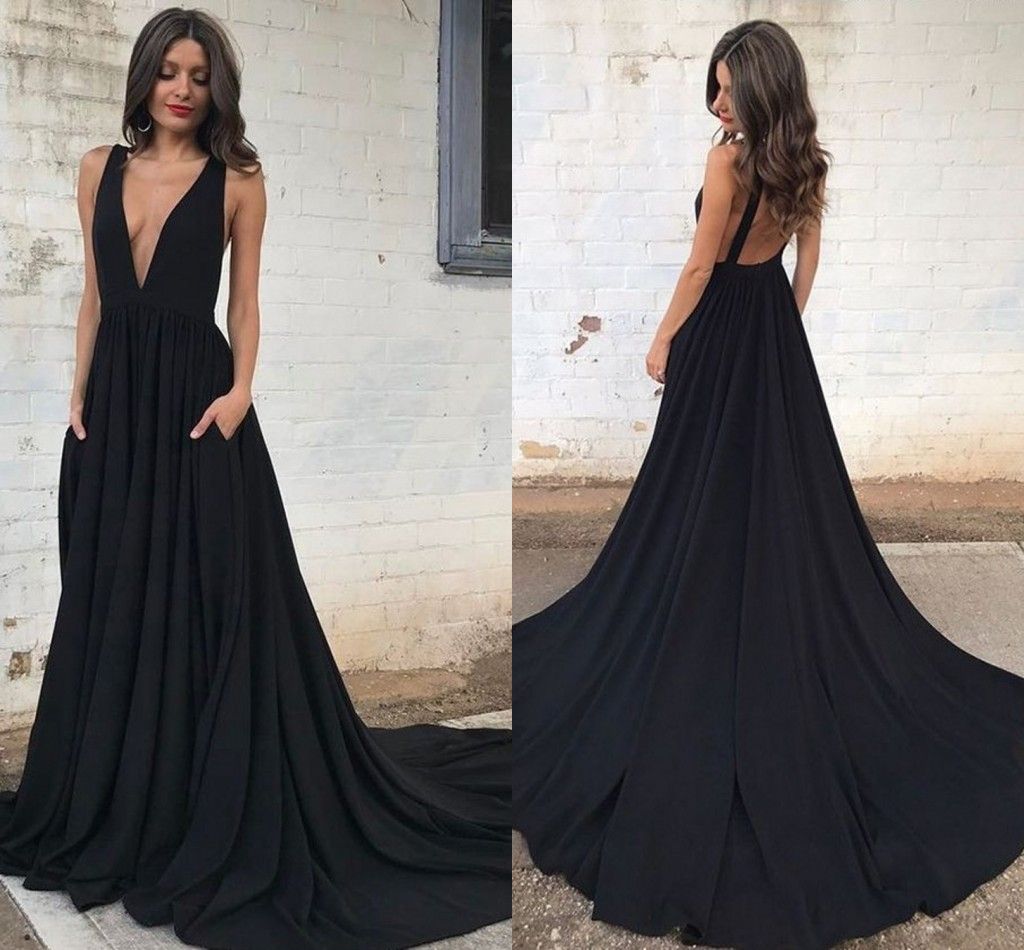 2017 Charming Black Long Prom Dresses Plunging Neck Ruffled Satin