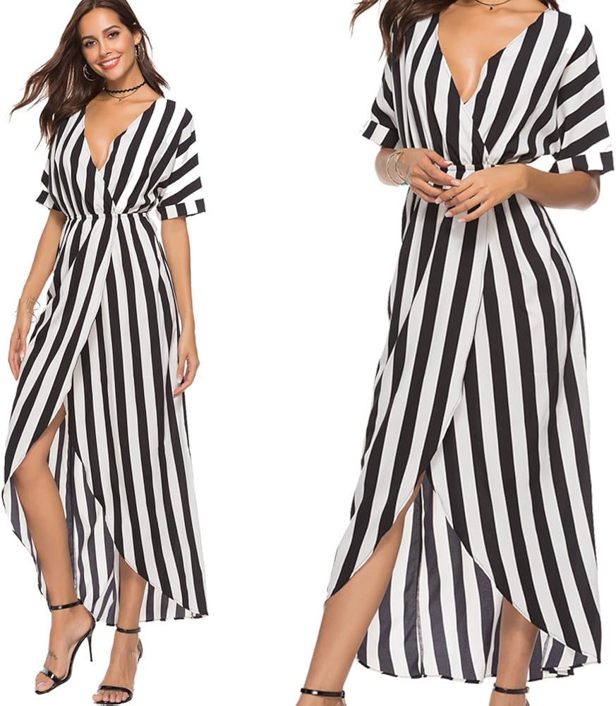 Women Dress Plus Size Deep V Neck Red White Stripe Hi Low