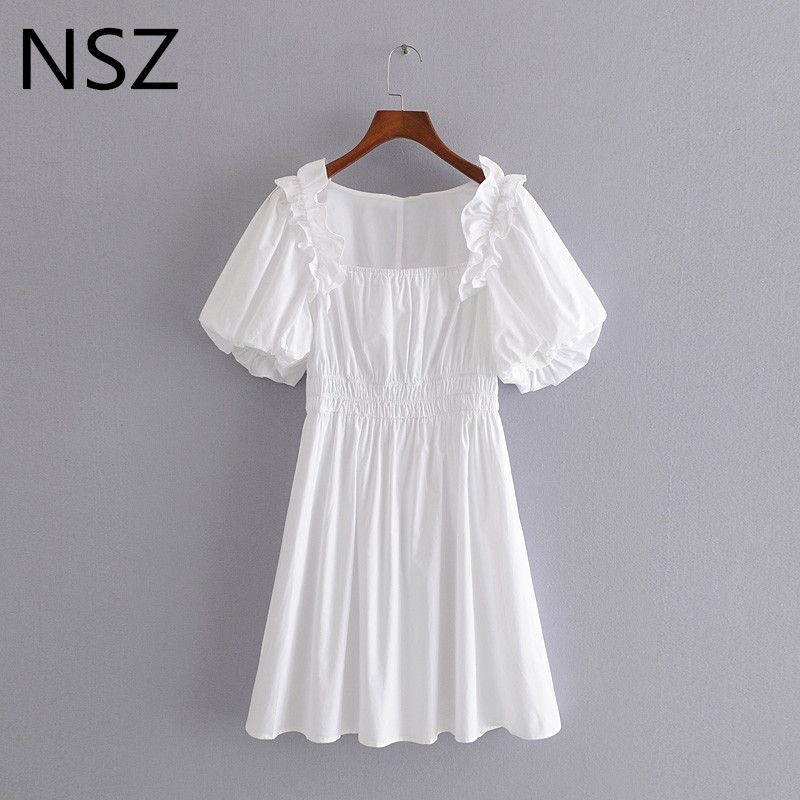 Nsz Women Cotton White Summer Dress Square Neck Ruffles Puff