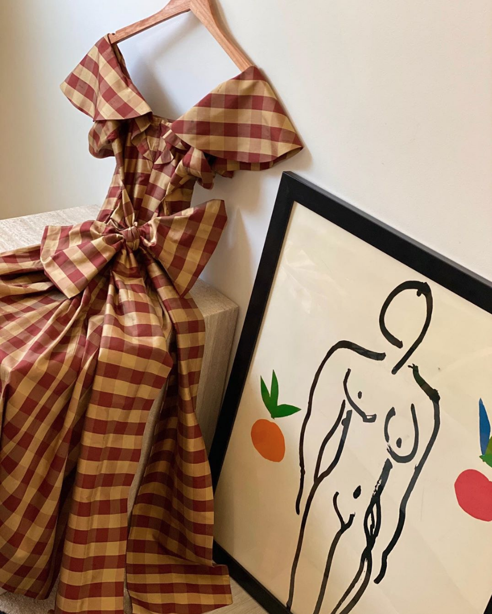 Batsheva Silk Taffeta Bow Back Maxi Dress Burgundy Check