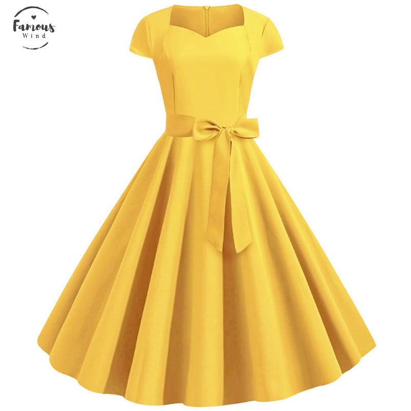 2020 Summer Solid Cap Sleeve Yellow Color 50s 60s Vintage Dress
