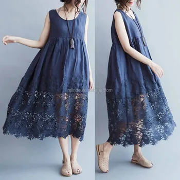 Women Summer Comfortable Linen Dress Sleeveless Round Collar Lace