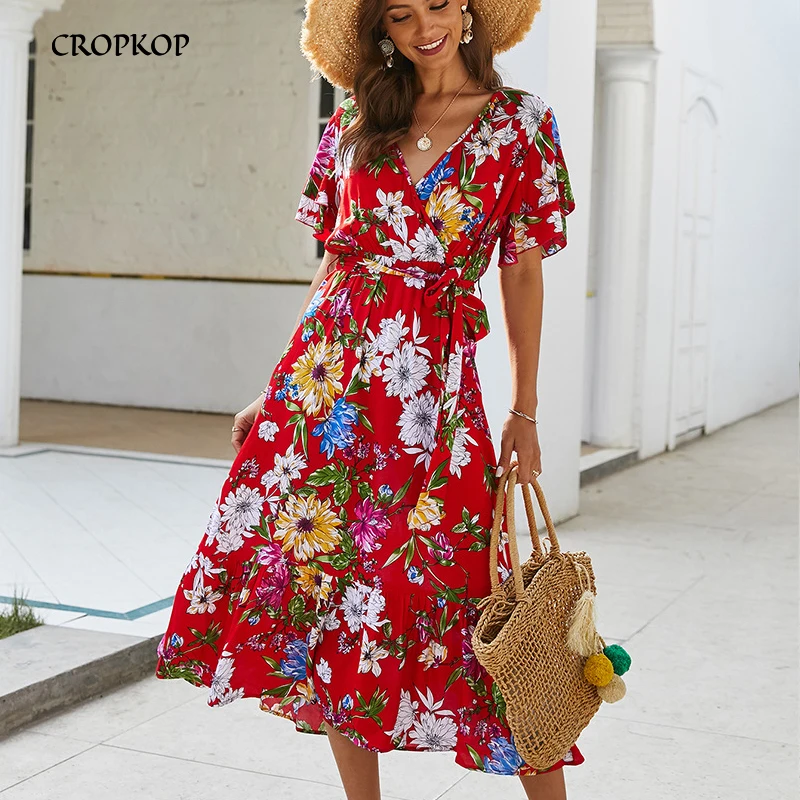 Boho Flower Print Summer Dress Ruffle V Neck Sashes Beach Long