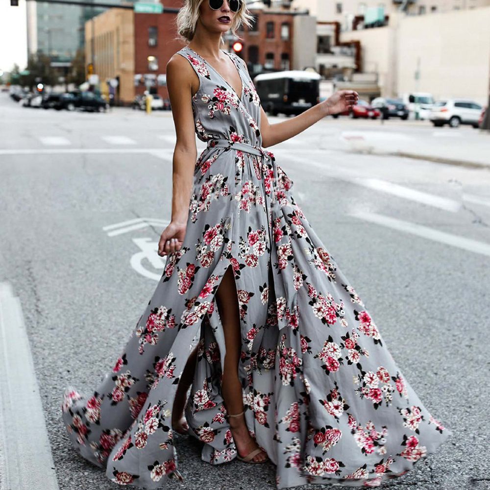 Summer Holdiay New Women Long Maxi Dress Slim Floral Print Deep V
