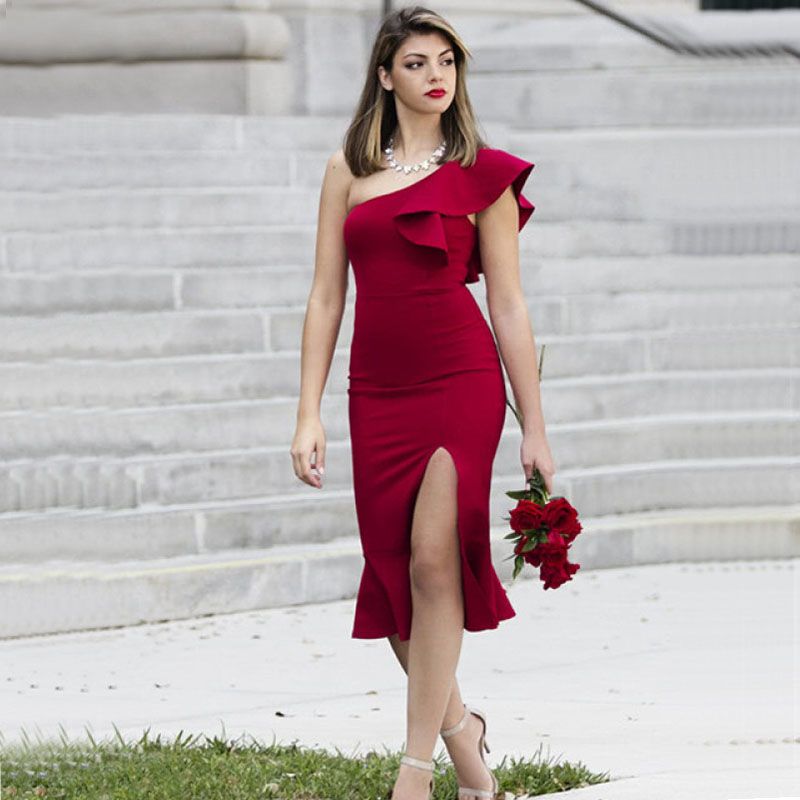Slit Fishtail Summer Party Dress Burgundy One Shoulder 2018 Women