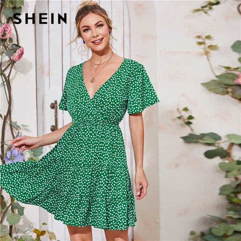 Shein Green Ditsy Floral Surplice Front Ruffle Hem Dress Women V