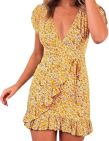 Summer Floral Print Mini Dress Deep V Neck Backless Ruffles