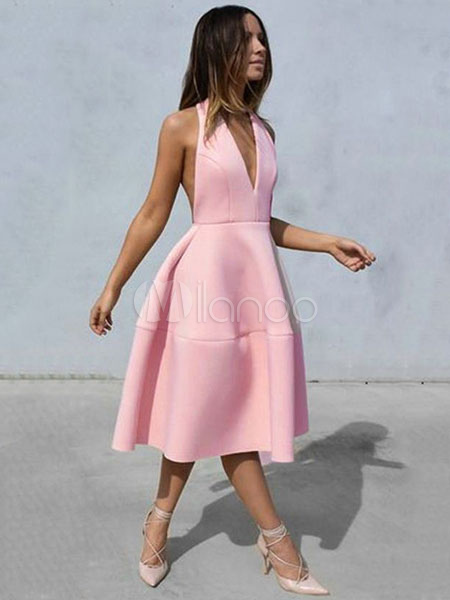 Pink Summer Dress Halter V Neck Solid Color Backless Long Dress