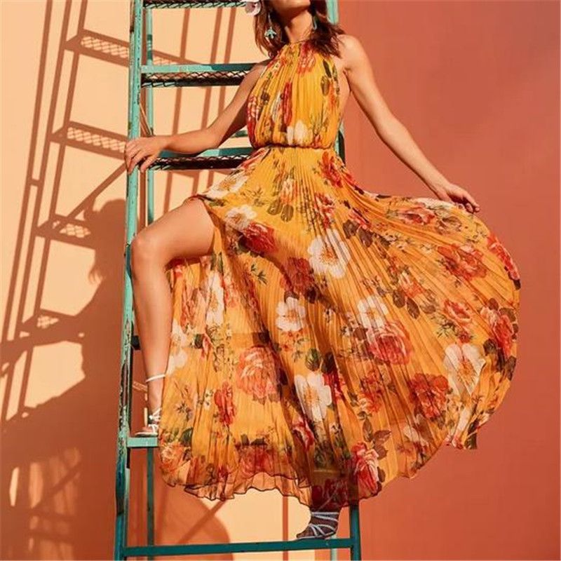 New Summer Women Sleeveless Halter Yellow Floral Maxi Dress Prom