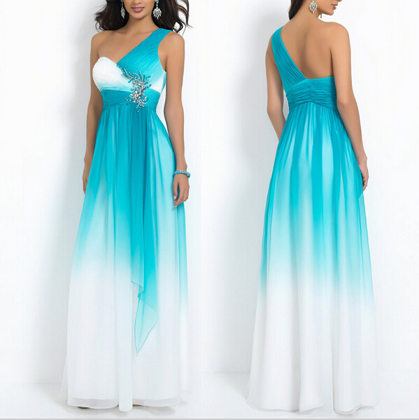 Elegant Beading Empire One Shoulder Gradient Ice Blue Prom Dresses