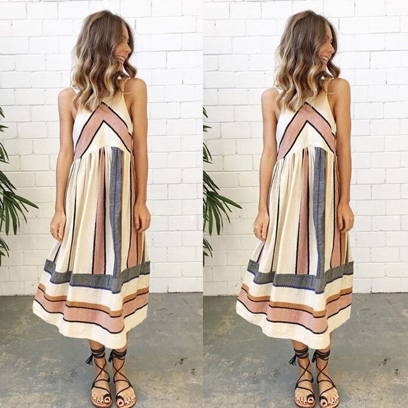 Womens Retro Sleeveless Summer Dress Geo Striped Tank Tunic Dress