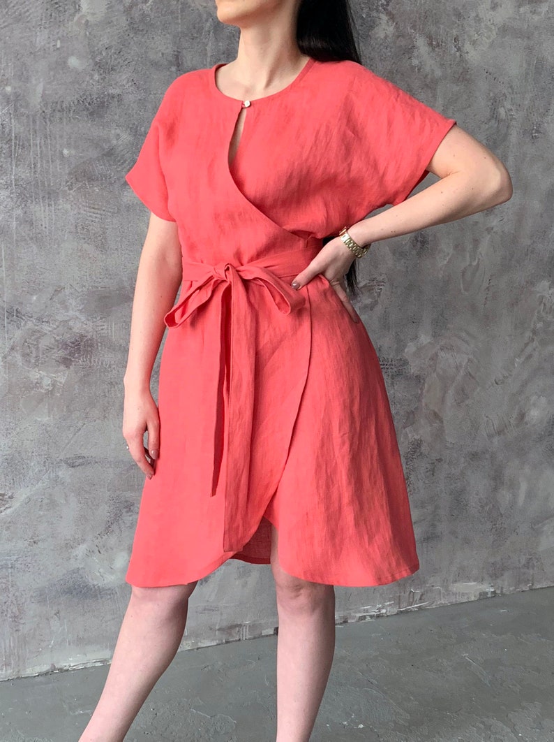 Linen Loose Kimono Wrap Summer Dress With Pockets Coral Pink Etsy