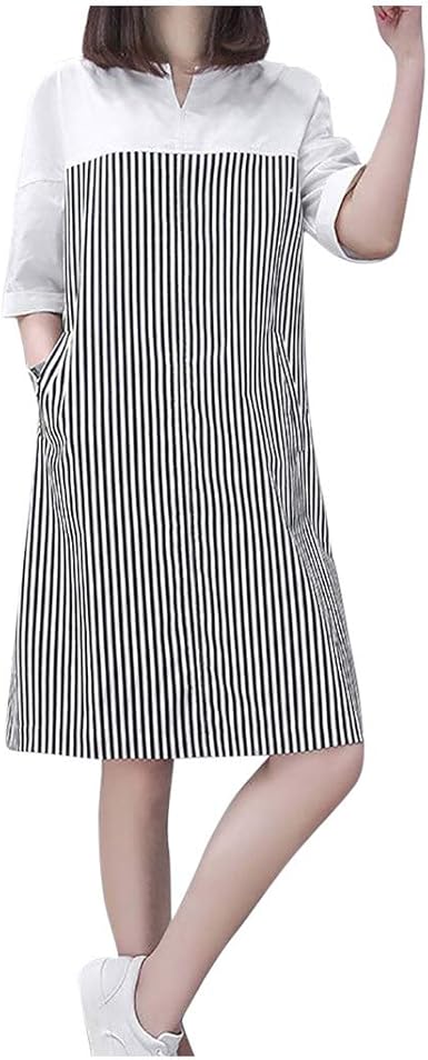 Fudule Women Shift Dresses Half Sleeve V Neck Striped Casual Loose