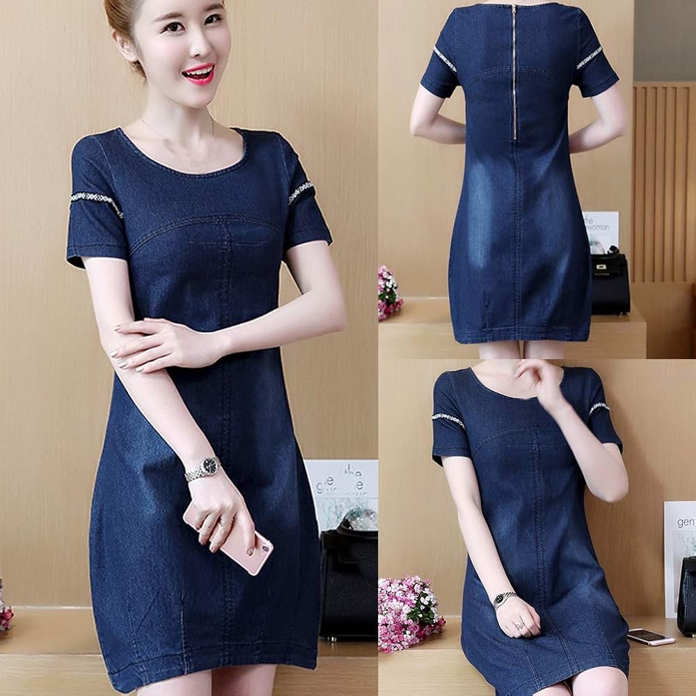 Koolee Fashion Women Summer Denim Loose O Neck Short Sleeve Knee