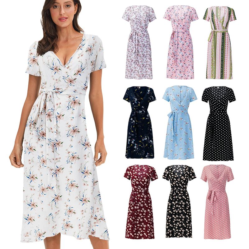 Fashion Floral Chiffon Knee Length Women Beach Dresses Boho V Neck