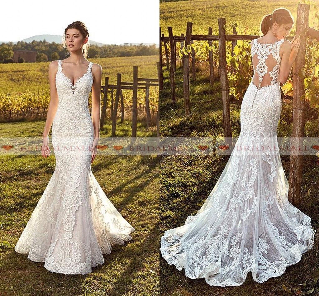 2019 Elegant Ivory Straps Deep V Neck Lace Mermaid Wedding Dresses