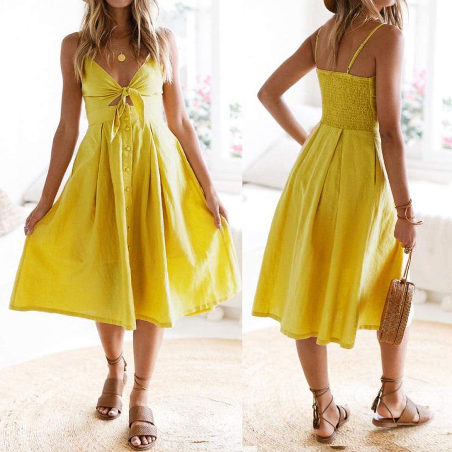 Girls Yellow Deep V Shoulder Strap Women Summer Dress Loose Long