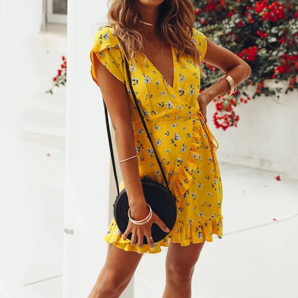 Summer Dresses Women Yellow Ruffles Casual Party Black Ladies Wrap