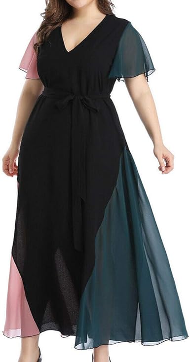 Women S Plus Dress Ruffle Short Sleeve V Neck Color Patchwork
