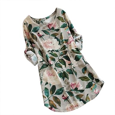 Women Floral Linen Dresses Plus Size Shirts V Neck Three Quarter