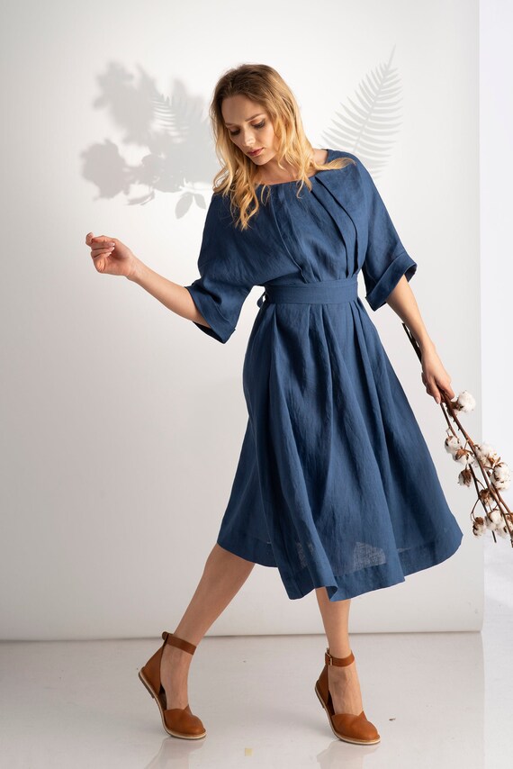 Linen Dress Summer Dress Blue Dress Belt Dress Loose Etsy