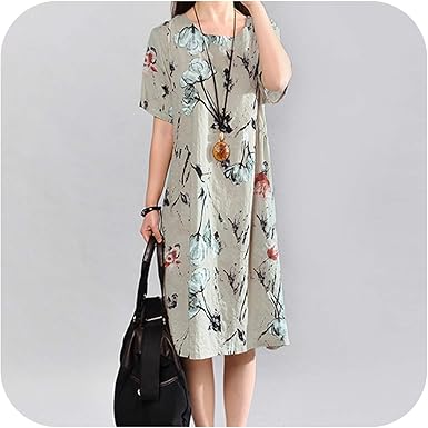 Summer Dress Women Vintage Floral Linen Dress Ladies Short Sleeve