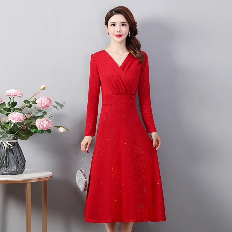 Voa Chinese Red Long Sleeve Silk Maxi Dress Women Party Woman