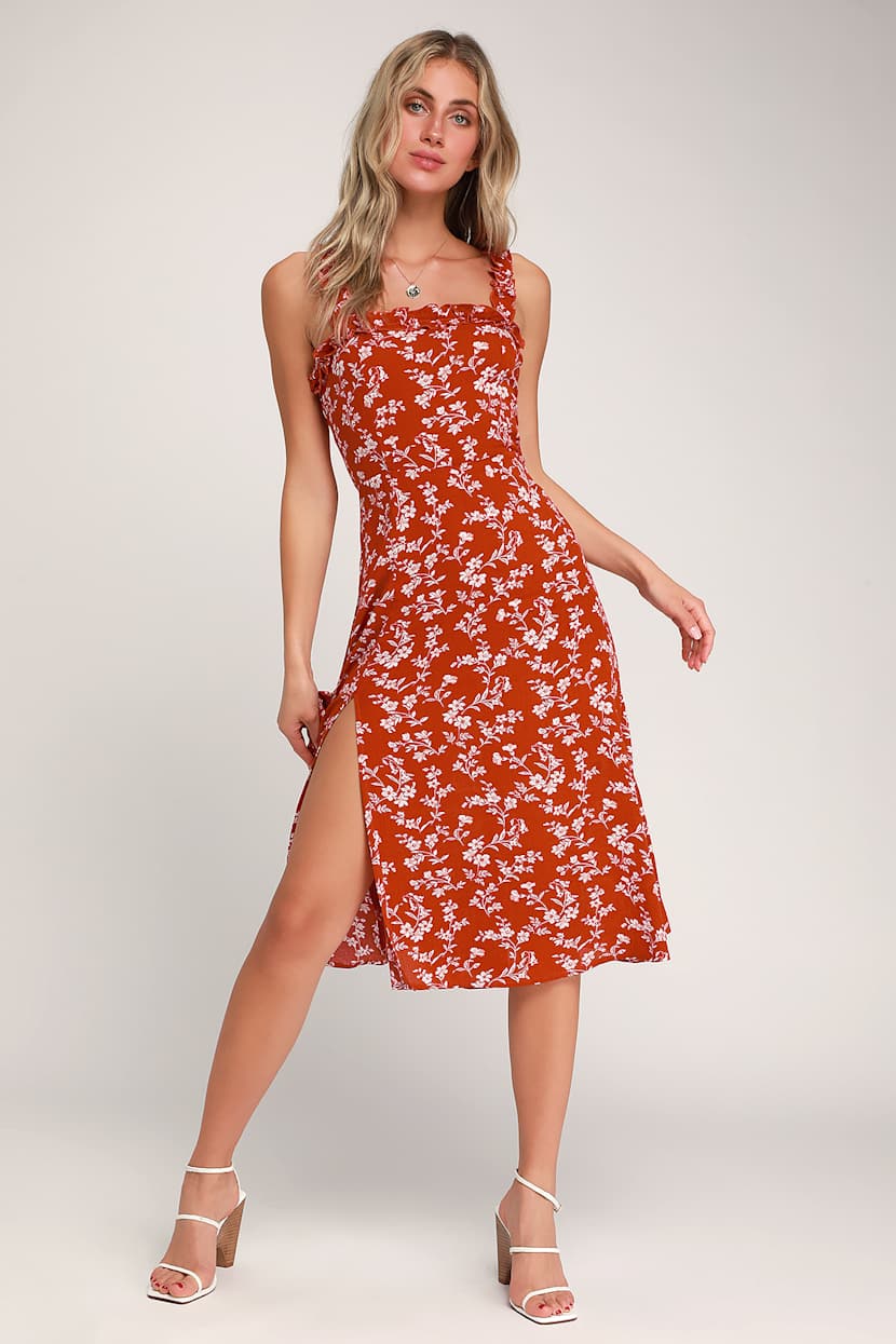 Pretty Red Dress Floral Print Midi Dress Ruffled Skater Dress