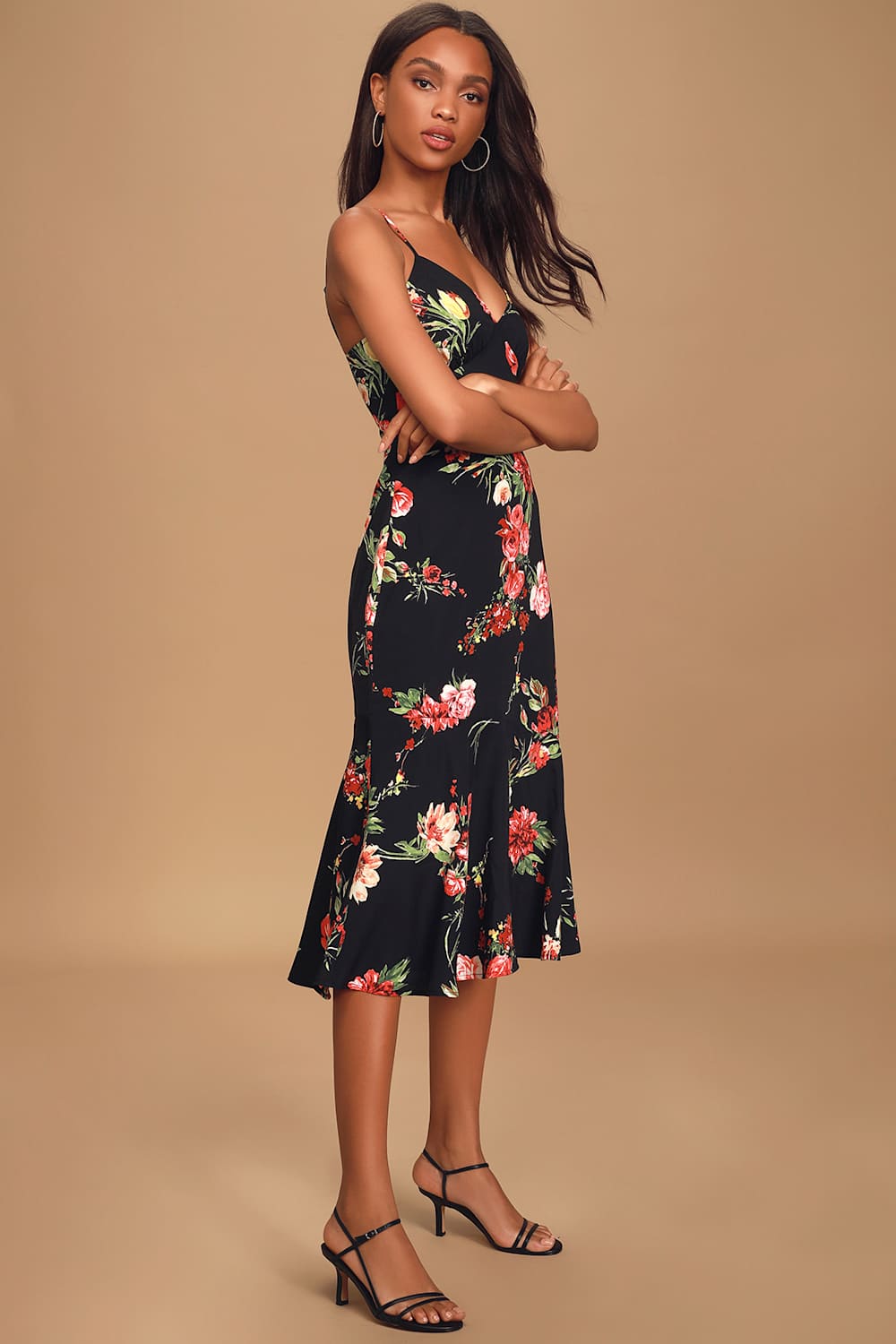 Lovely Black Floral Dress Sleeveless Midi Dress Slip Dress