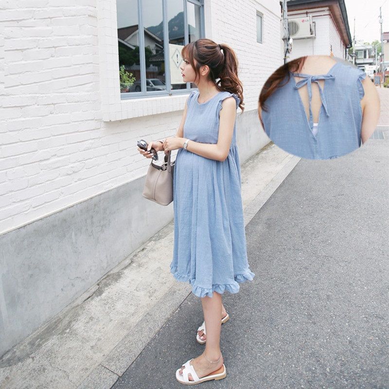 2020 Summer Fashion Ruching Linen Vest Maternity Long Dress Back