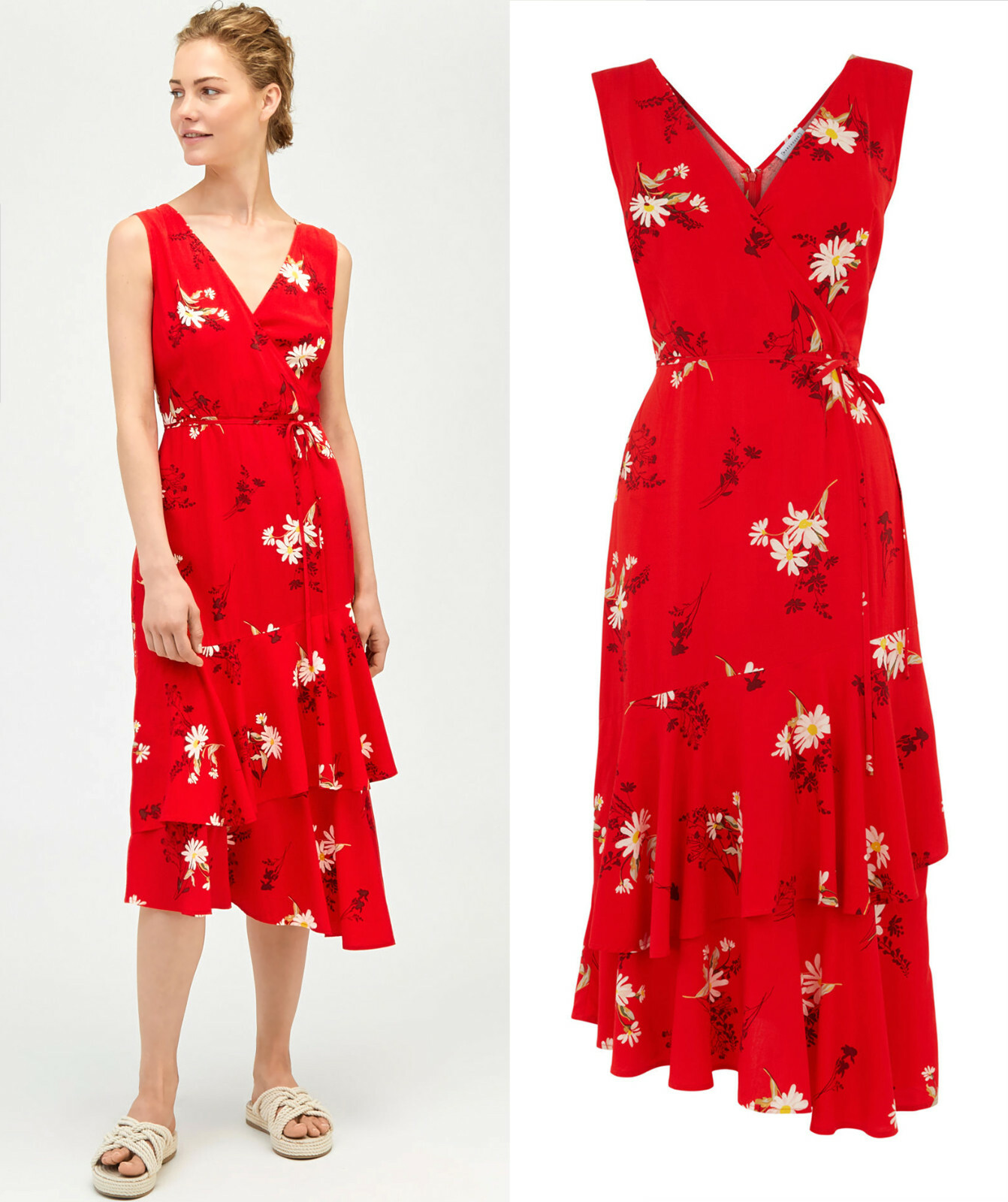 Charming Red Floral Print Midi Dress Floral Wrap Midi Dress
