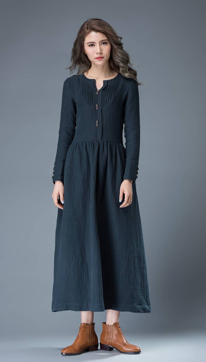 Navy Blue Summer Dress Linen Comfortable Casual Everyday Fit Flare Office Or Work Woman S Dress C843 Long Linen Dress Blue Summer Dresses Linen Dresses