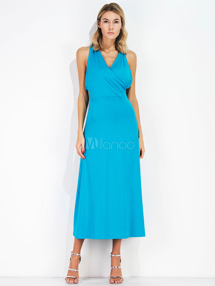 Summer Maxi Dress Ocean Blue Milk Silk V Neck Women S Sleeveless