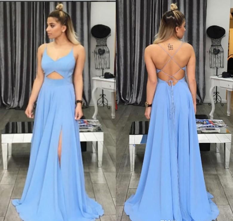 2019 Chic Ocean Blue Prom Dress Cheap Simple V Neck Chiffon Split