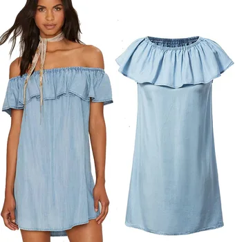 Summer Baby Blue Dress Sexy Off Shoulder Denim Dress Falbala Dress