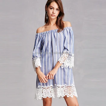 2017 Summer Stripe Pattern Off The Shoulder Bell Sleeves Crochet