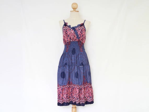 Vintage Bohemian Navy Floral Midi Dress Sexy Low Back Summer