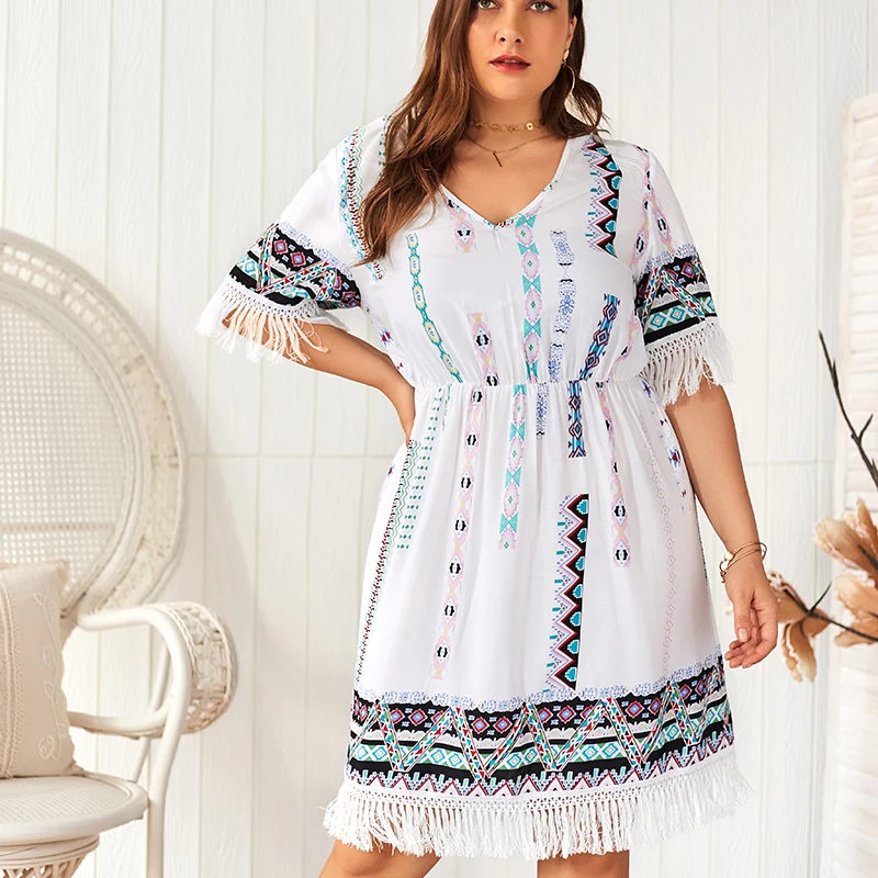 Plus Size Summer Vintage Tassel Dress 2020 Woman Mini Dress Summer