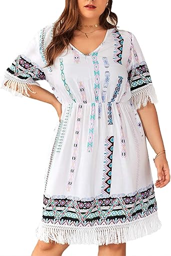 Himone Plus Size Boho Mini Dress Womens Tassel Short Gypsy