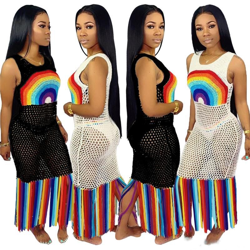 Women Sheer Tassel Beach Dresses Rainbow Print Sexy Long Swimsuit