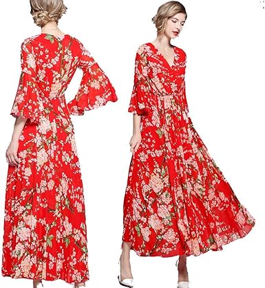 Red Maxi Dress Women Floral Tea Dress V Neck Long Sleeve Chiffon