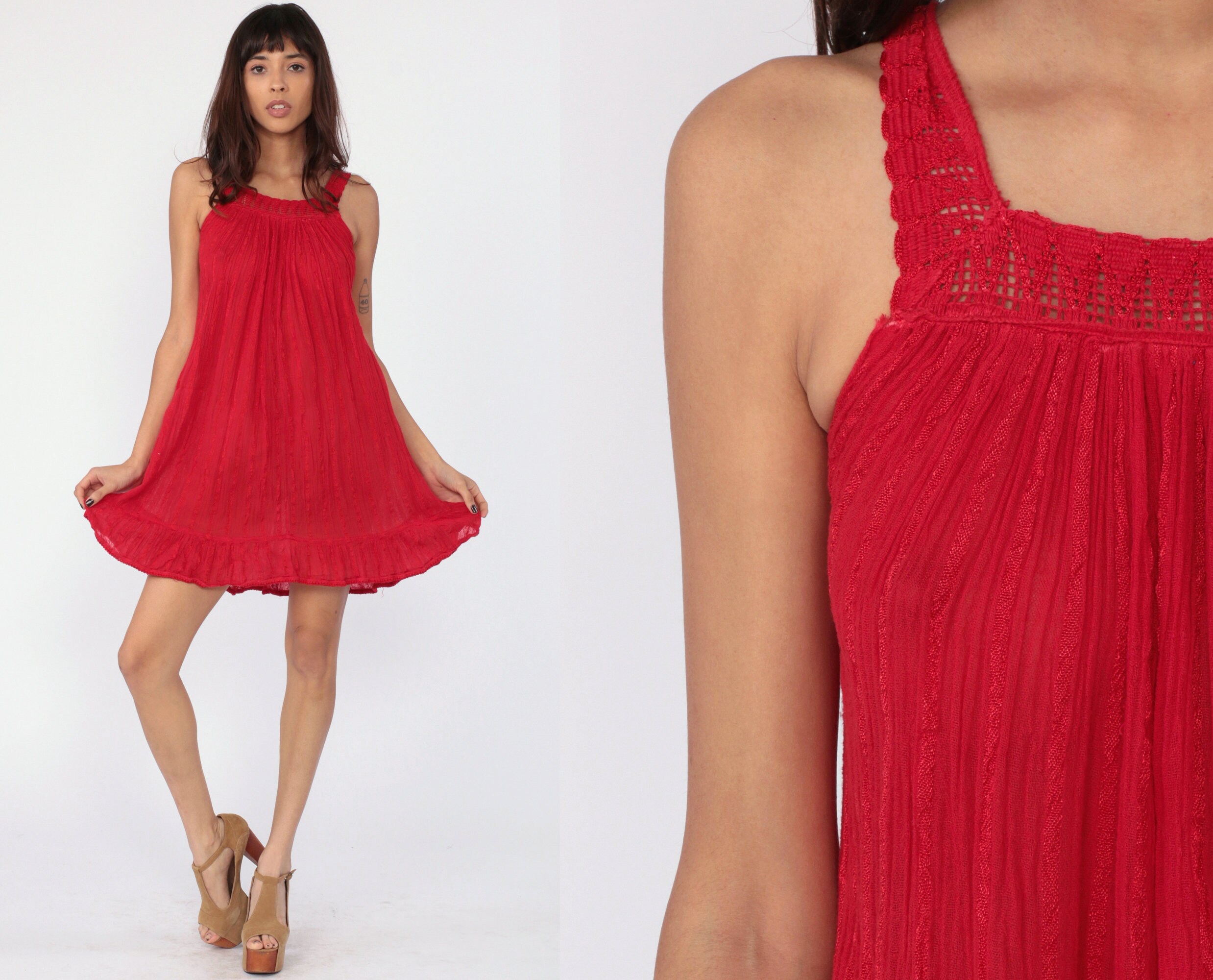 Boho Dress Red Gauze Dress Bohemian Mini Crochet Sundress