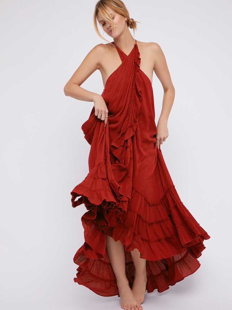 2019 Women Boho Red Wrap Maxi Dress Sheer Ruffled Hem Crisscrossed