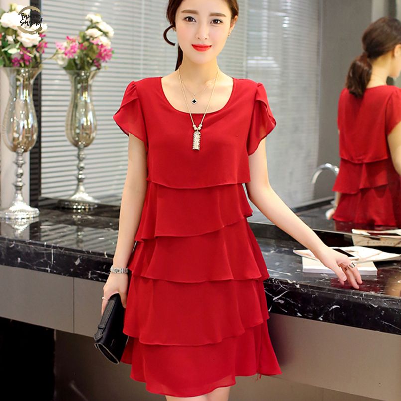 New 2019 Women Summer Dress Loose Chiffon Cascading Ruffle Red