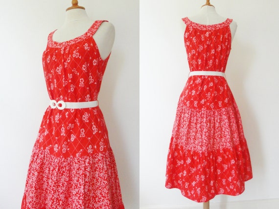 Red 70s Vintage Summer Dress With White Flowers And Squares Etsy