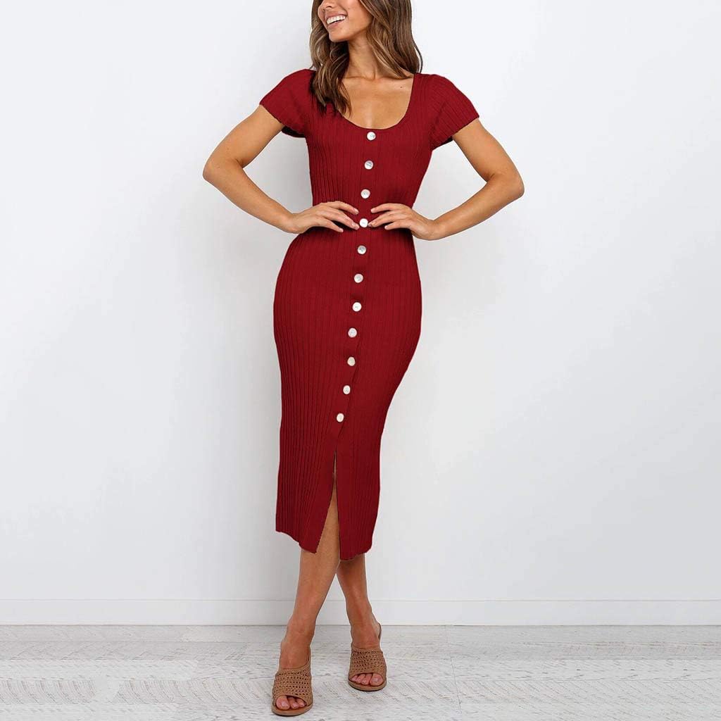 Women S Button Up Ribbed Knit Dress Scoop Neck Short Sleeve Casual