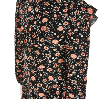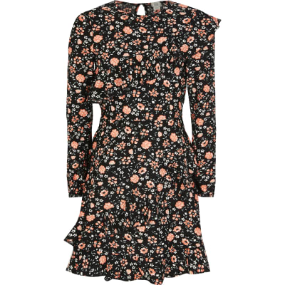 Girls Black Floral Ruffle Long Sleeve Dress River Island