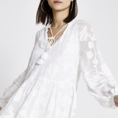 White Broderie Long Sleeve Smock Midi Dress River Island